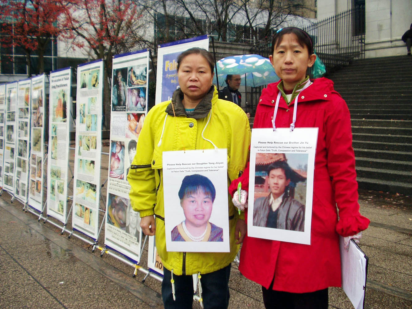 杨锦妍的姐姐也在胸前挂着妹妹的照片,她说,妹妹杨锦妍因为修炼法轮功,从九九年以来,已经被抓了七次了,受到残酷的拷打,吃了很多苦,今年七月十五日因为讲真相被抓,现关押在广东中山看守所,当局通知妹夫说要判刑。她希望哈珀帮助营救,使她妹妹能脱离苦海。