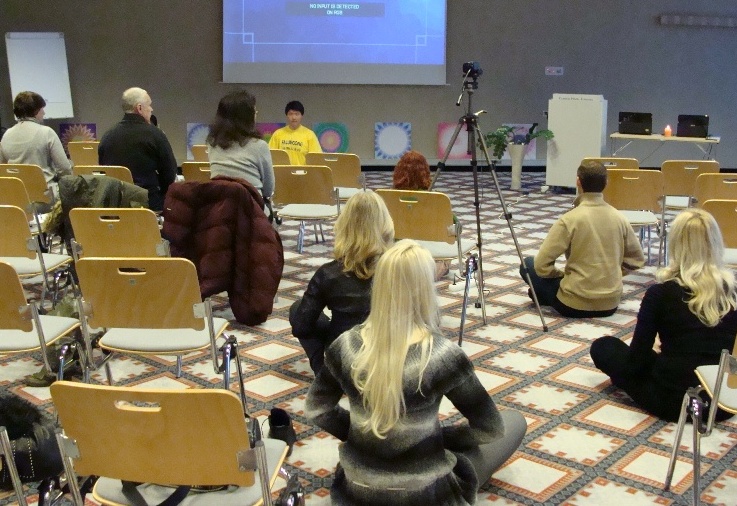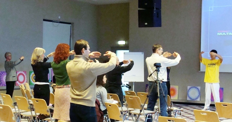 会议分为上下两场,下半场的时间就是用来介绍法轮功及现场教功。前来参加会议的人们专注地听着学员介绍法轮以及目前正在中国发生的对法轮功修炼者的残酷迫害。介绍以后,法轮功学员演示五套功法。观众非常感兴趣,纷纷站起来一起炼。学员仔细讲解每一套功法的要领;观众认真看着学员的动作,模仿着炼。整个会议厅气氛宁静祥和。