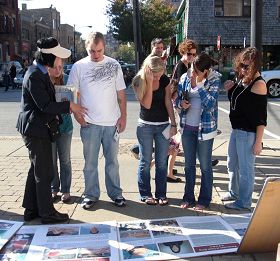 这天途经的一些年轻的华人,对展板上的信息产生了很大兴趣,经学员上前了解,他们大都是从中国大陆出来不久的学生。他们说在国内不了解这些,听到的也是反面的报道。学员于是给他们详细讲述了事实真相,揭露中共编造传播的种种污蔑法轮大法的谎言。一位女青年说,她是学新闻的,在国内深感一个新闻工作者不能真实报道新闻的困扰。学员向他们介绍《·九·评*共产党》和当前已有超过六千三百万中国人通过各种不同渠道在大.纪.元;网站上发表“三:退.”声明时,这位女青年和好几个年轻人都同意学员帮他们在大.纪.元;网站上声明退出曾经入过的团、队组织。当天有二十一人用这种形式发表了“三:退.”声明,其中有十一名退*团-、两名退!党!。