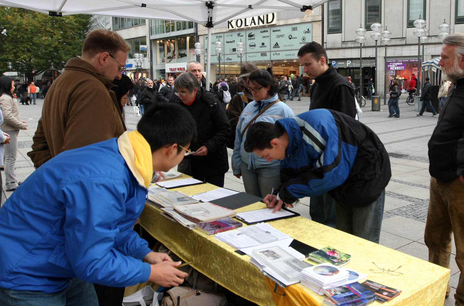 法轮功学员刚刚开始摆展台,就已经有不少德国人上来询问是否可以签名声援法轮功学员。也有不少人在看完揭露中共恶党迫害法轮功学员、以及中共建政后迫害中国民众的真相图片之后,直接就在摆放在图片旁的签名簿上签名,表明他们对中共邪*党-的抵制态度。