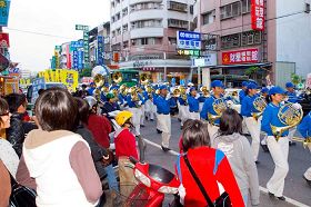 四百多位天国乐团成员在游行队伍中前导,唐鼓、腰鼓、西洋鼓等多支鼓乐队穿插在游行队伍中,隆隆的鼓声,吸引民众驻足观看。两旁商家的生意人特地跑出来探看,大都表示这样的活动能吸引更多人注意,能让更多的人重视。
