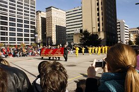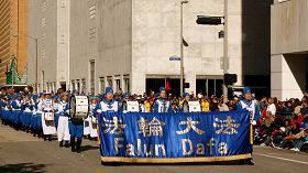 法轮功的游行队伍举着“法轮大法”和“真善忍”的中英文横幅,天国乐团统一身穿宋朝鼓乐服,他们吹奏《法轮大法好》、《法鼓法号震十方》、《美丽的美利坚》,鼓乐整齐嘹亮,令人耳目一新;炼功队成员身穿黄色炼功服,演炼功法,引起许多市民鼓掌叫好、拍照留念。