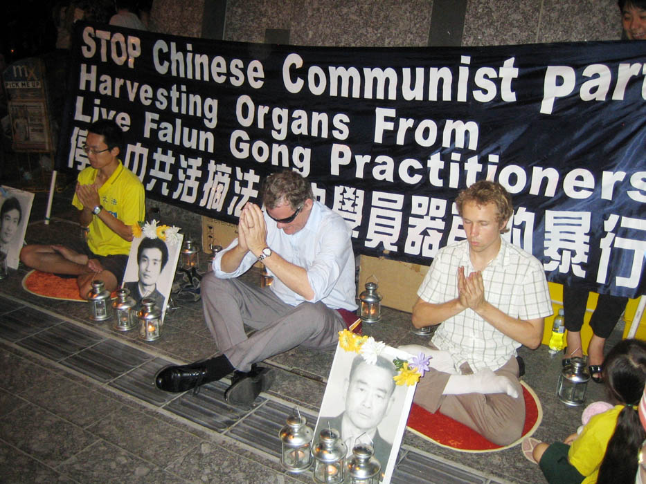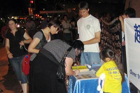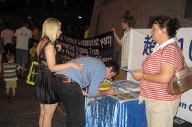 另一位西方中年男子则站在被迫害致死的法轮功学员遗照前双手合十,并坐下来与学员一同静坐了数分钟。当晚很多中西方民众接过了真相传单,并签名支持法轮功。