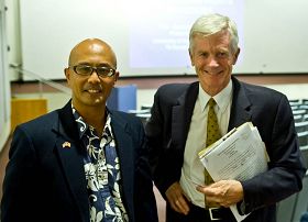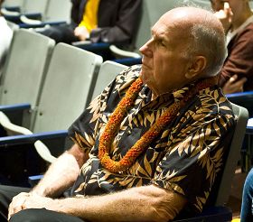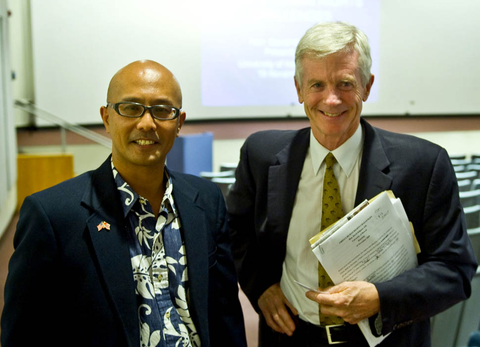 ![]() 夏威夷大学社会科学院的院长督巴诺斯基(Dean Richard Dubanoski)在听演讲。 |