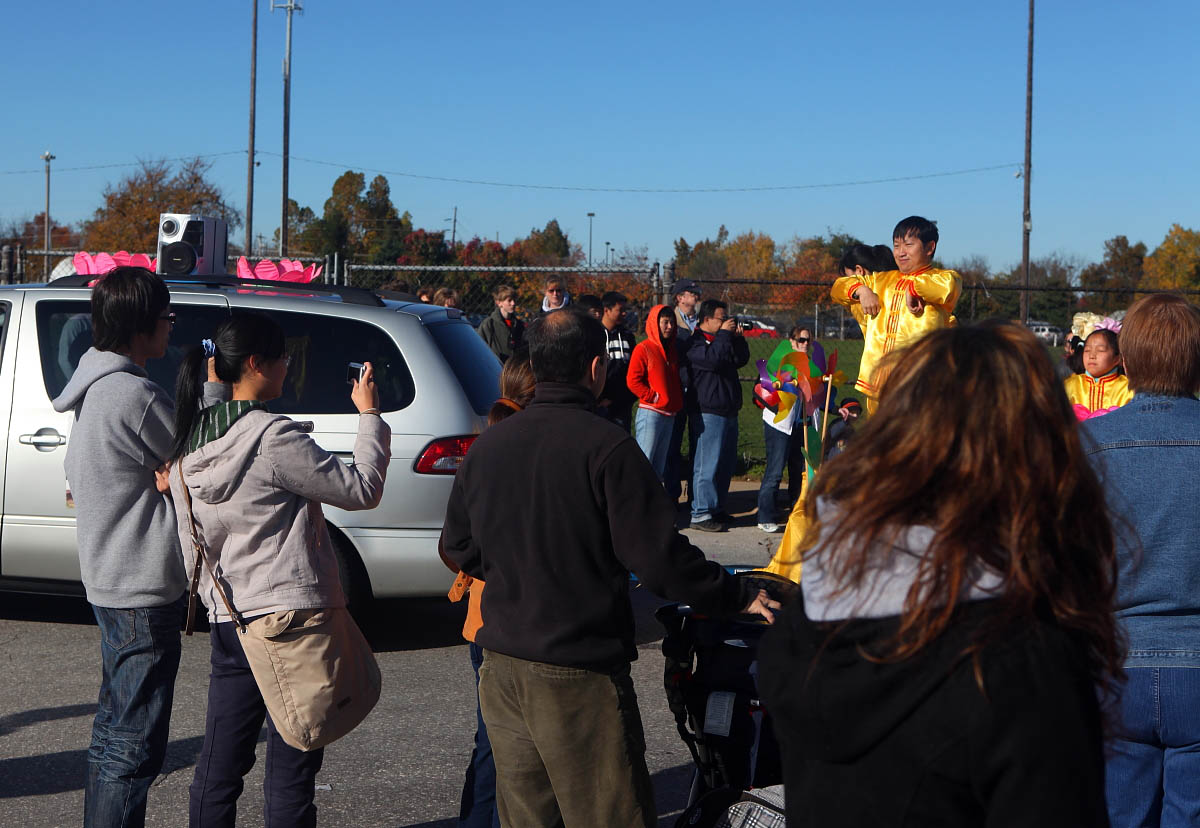 四个从堪萨斯来的非洲裔美国女孩儿路过免费教功的展位,听到这么好的功法在中国大陆受到迫害,她们很惊讶竟会有这样的事情。在了解了法轮功和迫害的真相之后,她们当场就跟着炼起功来。很多美国学生都对第五套功法感兴趣,跟着法轮功学员在展位前面学习打坐,有几个人立即就可以双盘。