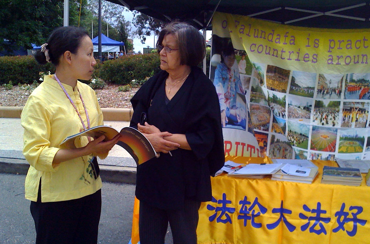 在法轮功摊位旁边摆摊卖工艺品的是两位华人,男的刚从中国来悉尼不久,女的则在这里有一段时间了,所以她了解法轮功多一点。她说:“我在外面摆摊很久,经常看到法轮功学员讲真相。我明白法轮功被迫害的真相,但不知道你们那些资料是不是有专门组织提供的?”法轮功学员向她解释,他们是自己掏钱设置摊位和印刷资料,只为让被中共蒙蔽了的人们了解法轮功的真相。而那个刚从中国来的男士开始误认为法轮功“搞政治”,通过学员和他讲解,他明白了真相,知道了中共历来对无辜的中国人民残酷迫害。他拿了《·九·评*共产党》和其它真相资料,在自己的摊位里坐着聚精会神地读了很久。