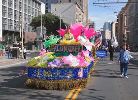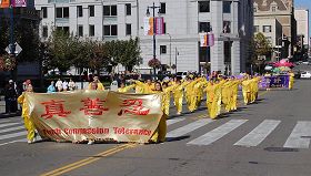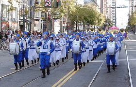 上午十一点,游行从旧金山第二大道沿着市场街一直到市政厅。今年的游行有九十多个队伍参加,有退伍和现役军人及各式军乐和仪仗队。参加的众多团体中祥和的法轮功队伍让人惊喜,观看游行的人们纷纷鼓掌表示欢迎和支持。
