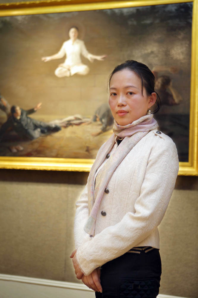 来自加拿大的女画家陈肖平有三幅作品入围,其中一幅名为《震撼》。她说,自己是在明慧网上看到一篇文章,里面讲述有一位中国的法轮功学员在狱中遭到迫害,她没有恨那些对她施以酷刑的狱警,而是平静的打坐,整个身体突然腾空而起,这种真实的景象令现场的狱警惊呆了,有的拿着刑具的手停在半空,有的抱头倒地,有的吓得目瞪口呆……。而她自己看到这个故事也感到很震撼,所以就画了这副作品。