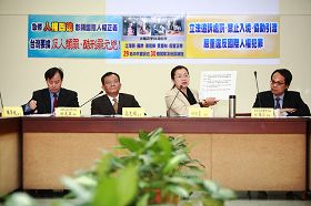 图1:“彰显国际人权正义 台湾要擒‘反人类罪’、‘酷刑罪’元凶”记者会。出席者包括立委田秋堇(右二)、前台权会长邱晃泉(左一)、民间司改会执行长林峰正(右一)、立委高志鹏等人。