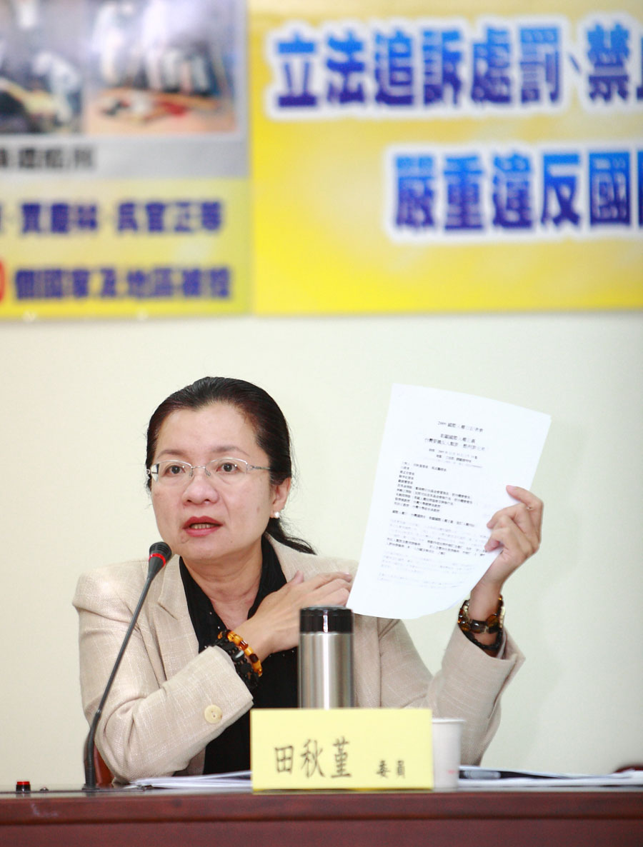 田秋堇说:“试问,这样双手沾满血腥的凶手却要让他风光踏上台湾土地,人权是普世核心价值早已是台湾朝野的共识与荣耀,然而我们现在不禁要问,台湾是否要自绝于世界‘普世原则’之外?光是签署两公约还不够,所以要推动制订和修订这四项法律加以落实。”