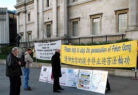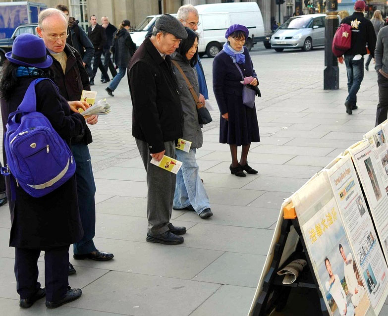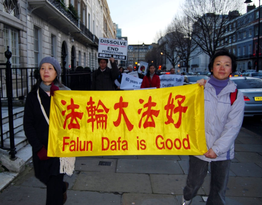 记者会后,法轮功学员们手持横幅和标语牌,从鸽子广场出发,途经伦敦最繁华热闹的商业街,游行到中共使馆前。在中使馆前,学员们集体炼功并举行了烛光守夜活动。