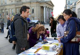 许多人驻足观看展板,认真阅读传单,然后在征签表上签名表达对法轮功学员反迫害的声援。