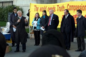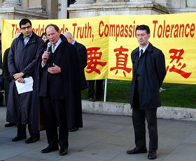 下午两点,法轮功学员在广场上召开了记者会,前来声援的演讲者有欧洲议会副主席爱德华·麦克米兰-斯考特先生、前加拿大亚太司司长大卫·乔高先生、欧洲法轮功之友协会主席约翰·迪先生(John Dee)等,国会议员格兰德·杰克逊女士(Glenda Jackson)及伦敦议会议员、伦敦巴耐特区(London Borough of Barnet)区长布莱恩·柯曼先生(Brian Coleman)也发来支持信函。