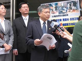 ![]() 台湾法轮大法学会理事长张清溪教授至台湾高等法院检察署,按铃控告前河南省委书记徐光春“因参与迫害法轮功修炼者,涉犯残害人群治罪条例”。 |