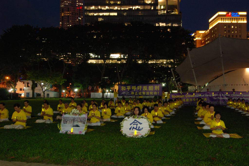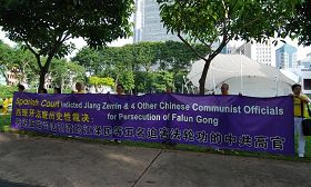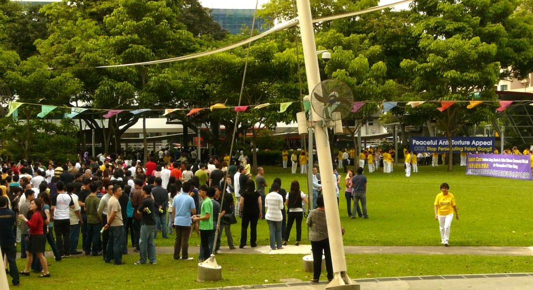 ![]() 新加坡人力部的数百位工作人员因办公大楼在举行防火演习而来到学员们集会现场的草坪上,从而看到了学员们打出的真相横幅 |