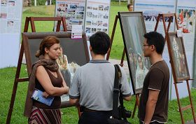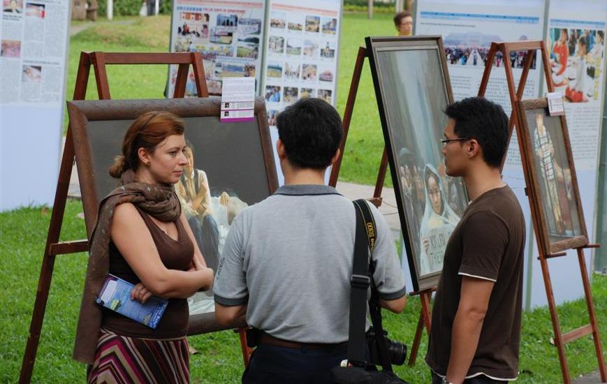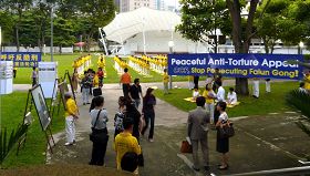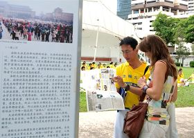 一位来自日本现在新加坡工作的男士主动要求在现场拍照留念。他表示这是第一次近距离看到法轮功的集会活动。令他吃惊的是在管理严厉的新加坡社会还能看到这样的场面,他感到一种自由的气氛。针对正在持续发生的迫害,他说,“我知道中共是什么。六‧四事件发生时,我在中国读书。”