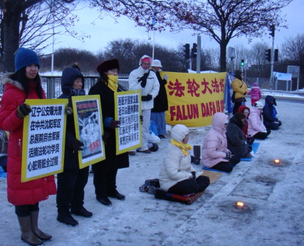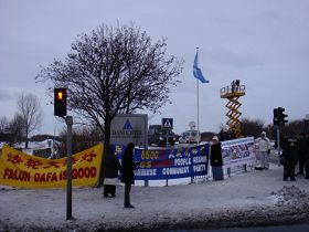 法轮功学员在贝拉会议中心外拉开“法轮大法好”横幅,写着“辽宁公安曝光曾在中共辽宁军区总医院目击军医活摘法轮功学员心脏肾脏全过程”、“西班牙国家法庭近日以酷刑罪和群体灭绝罪起诉江泽民、罗干、薄熙来、贾庆林、吴官正”等的展板,并展示中共酷刑迫害法轮功修炼者的证据。学员们冒着零下四、五度的严寒,在寒风中平和地演炼功法,来往的汽车中时常有人鸣笛致意。