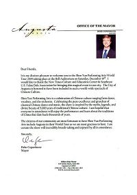 市长并且说:“奥古斯塔的市民们以最殷勤的地主使该市入选神韵艺术团的世界巡演的行程,这是该市市民最幸运的事。确信神韵的演出将令人无比惊叹并为所有观众激赏。”