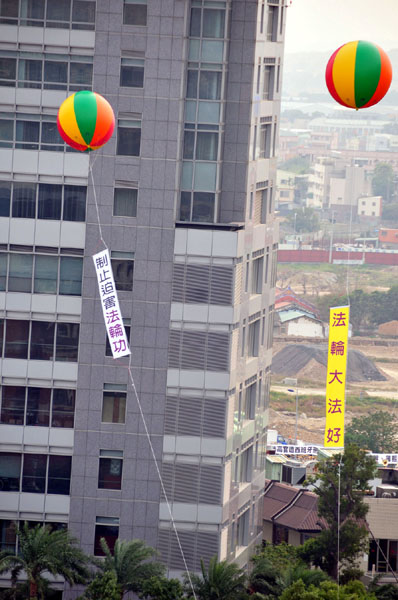 ![]() 裕元酒店后面的空飘气球上写着 “法轮大法好”、“制止迫害法轮功”,老远就看得到。 |