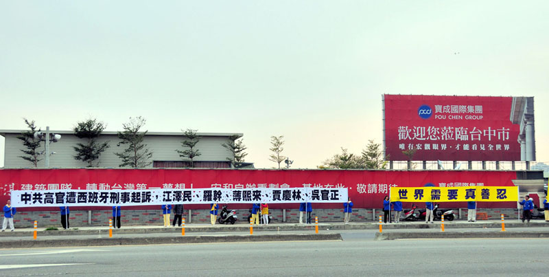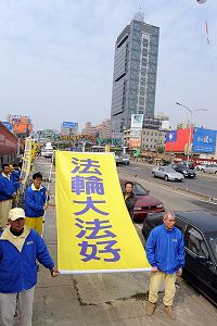![]() 裕元酒店斜对面的中港路三段上,法轮功学员打出的横幅。 |