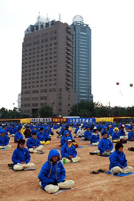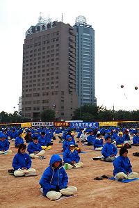 ![]() 法轮功学员集合在裕元酒店旁的空地上炼功,学员身后的蓝色建筑物即为裕元酒店。 |