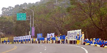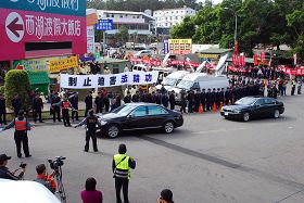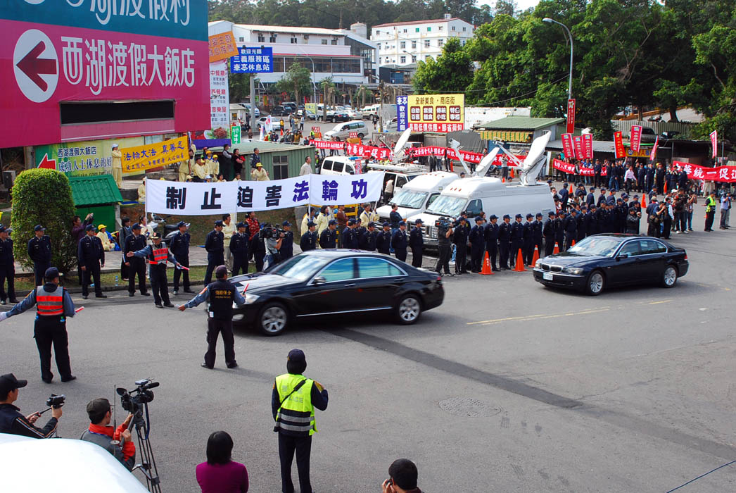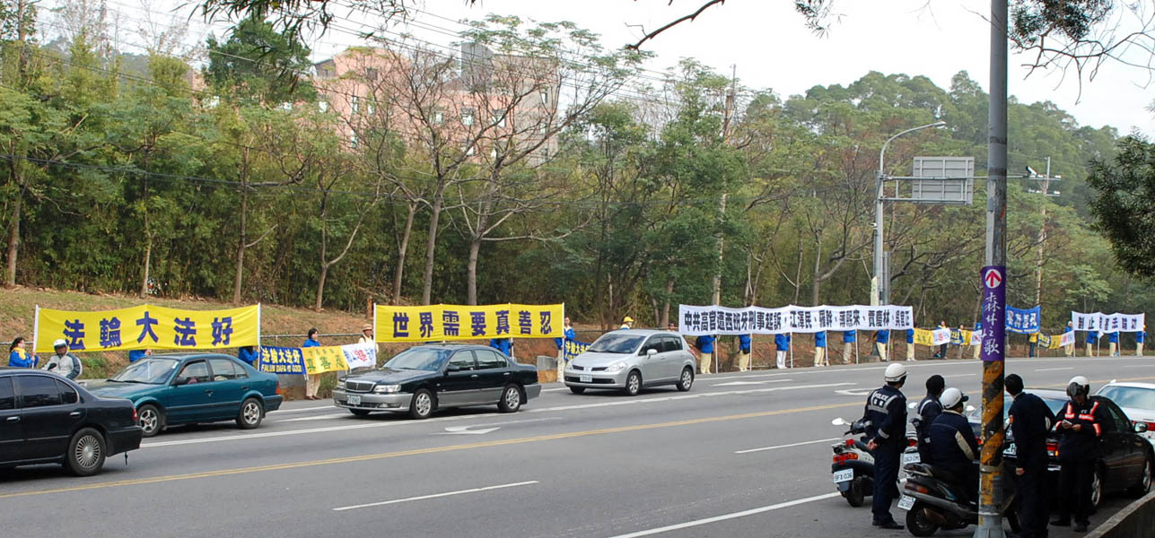 下午二时,陈云林一行人下了三义交流道,随处可见法轮功学员呼吁制止迫害的横幅。在三义木雕博物馆前,陈云林一下车正前方映入眼帘的就是法轮功学员静坐抗议的画面,陈云林快步窜入馆内。据现场杨小姐转述,法轮功学员近距离地喊话,陈云林都看到而且听到了。
