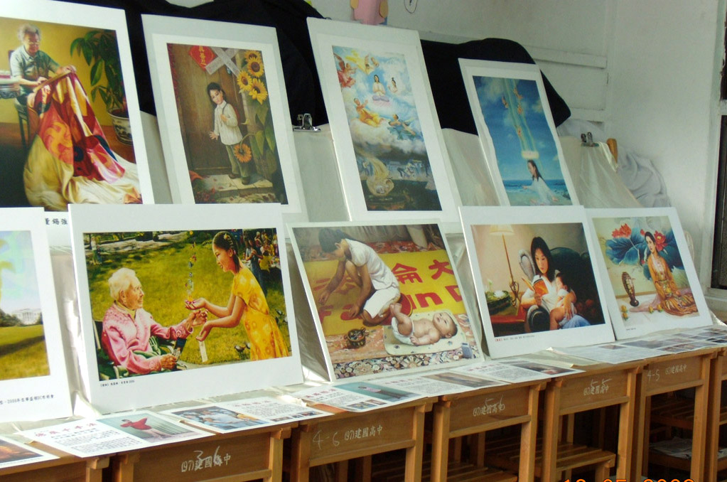 同学们与老师们发现这里有一幅幅精美的画作,便好奇地走了进来。他们注意到这些画作有着更深的内涵,才知道是修炼法轮功的艺术家们所画的。有些人不知道法轮功,也有些人约略听过或是在外头看见,但是在这一次美的飨宴中又更加清楚法轮功究竟是什么样的功法,为什么无辜被中共迫害。