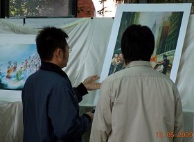 在展览正式开始不久,一位已经毕业的校友,饶有兴趣地来到教室,社长上前询问是否需要导览,这位校友欣然同意。在导览过程中,社长详尽地一一介绍每幅作品的重点及作者想要表达给世人的涵义。在介绍的过程中,这位校友提出了一个问题,既然法轮功是这么好的一个功法,那中共为什么要迫害法轮功呢?于是社长便叙述了中共几十年来迫害人民的过程,及由于中共前党魁妒嫉等因素,致使法轮功遭受迫害。