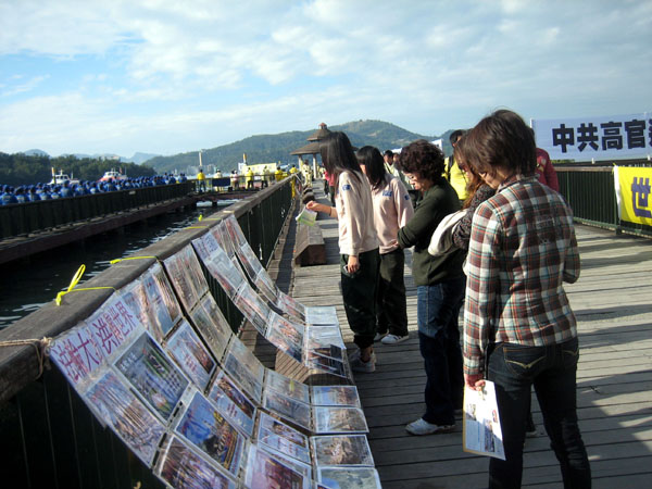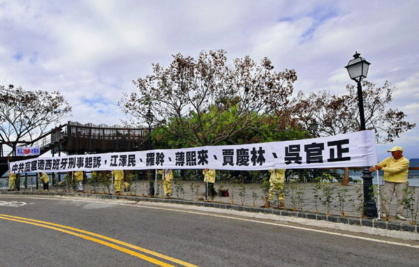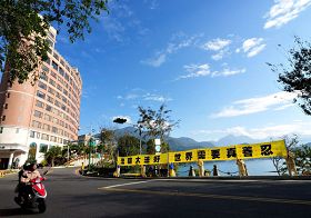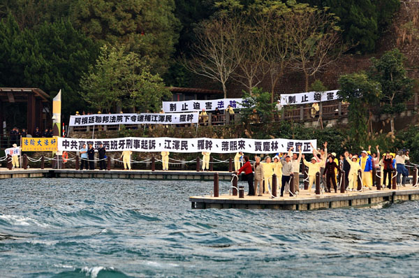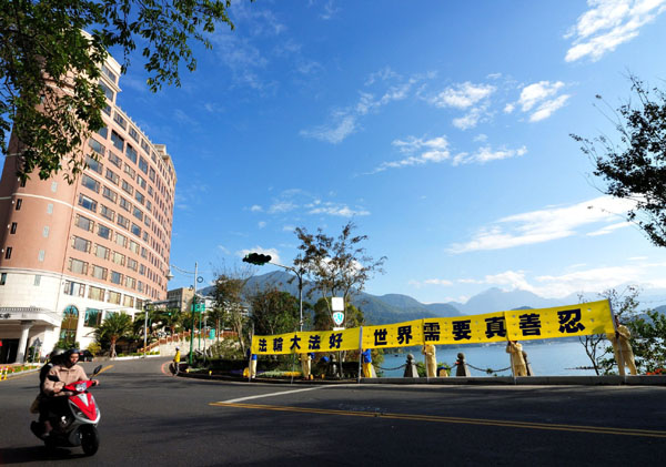 从下高速公路到日月潭,几处陈云林一行必经之地,及日月潭内的景点玄光寺、达伊绍码头,法轮功学员早已到达,在中共官员经过之时看到、听到“法轮大法好”、“制止迫害法轮功”的横幅与呼声。