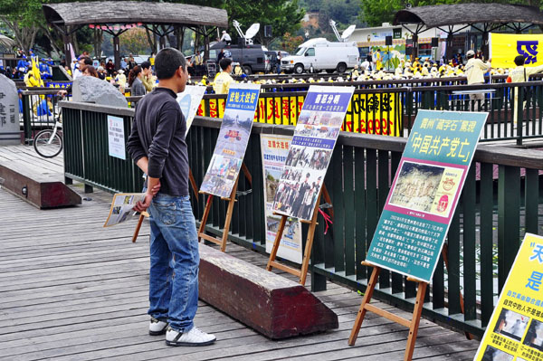 ![]() 在日月潭的达伊绍码头四周摆放法轮功真相展板,游客及警察认真看展板内容。 |