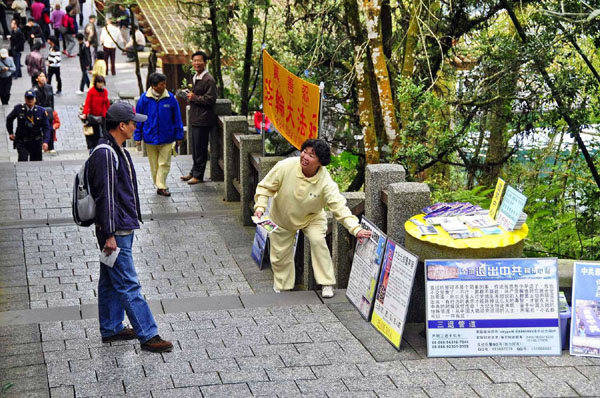 ![]() 法轮功学员亲切解说,盼大陆游客能明真相。 |