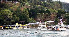 当游艇进入达伊绍码头的视线时,聚集在达伊绍码头上的学员同样立刻大声呼喊,一千多位学员的声音震撼天地。游客、警察、商家无不屏息注视这长达数分钟震撼人心的呼喊。布满码头的横幅、停止迫害的呼声,让声势浩荡的游艇队伍不敢靠近,只绕了不到三分之一的湖面即匆匆结束。码头上的游客也笑着说:看到法轮功的阵势,他们就不敢靠近了!