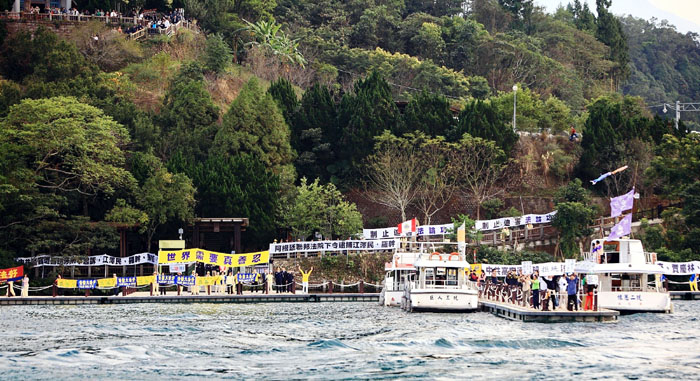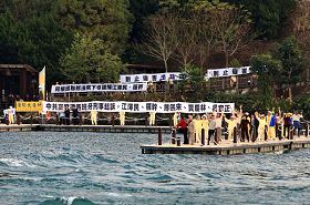 ![]() 法轮功学员在日月潭玄光寺底下的码头,对中共官员呼喊“法轮大法好”、“制止迫害法轮功”等口号,过程平和。 |