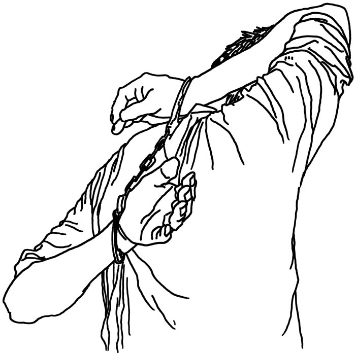 ![]() 演示吉林市九站派出所酷刑:双手背铐,并在手铐内强行塞入塑料瓶,使手铐深深陷进手腕内,使人疼痛难忍,双臂几乎折断 |