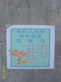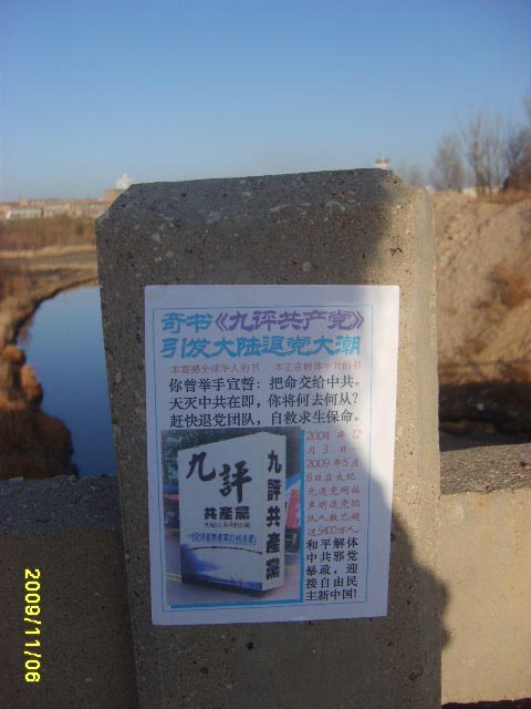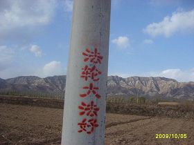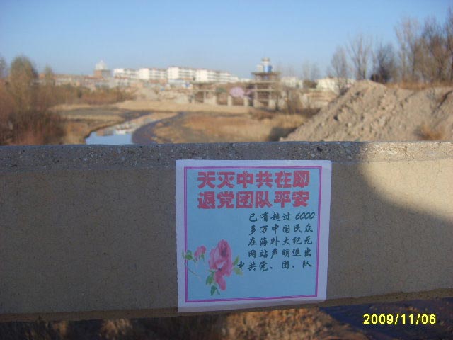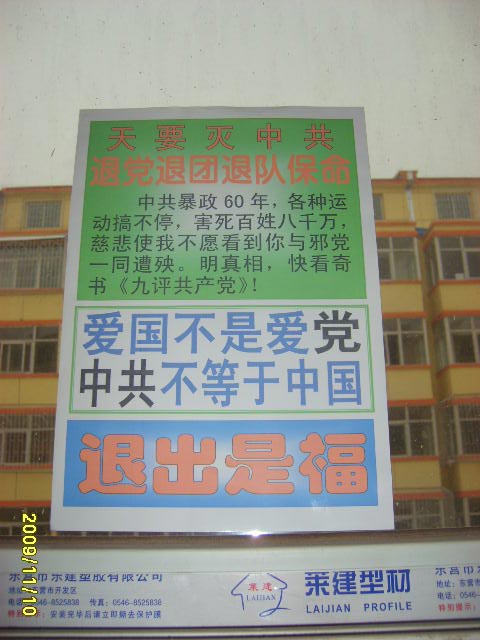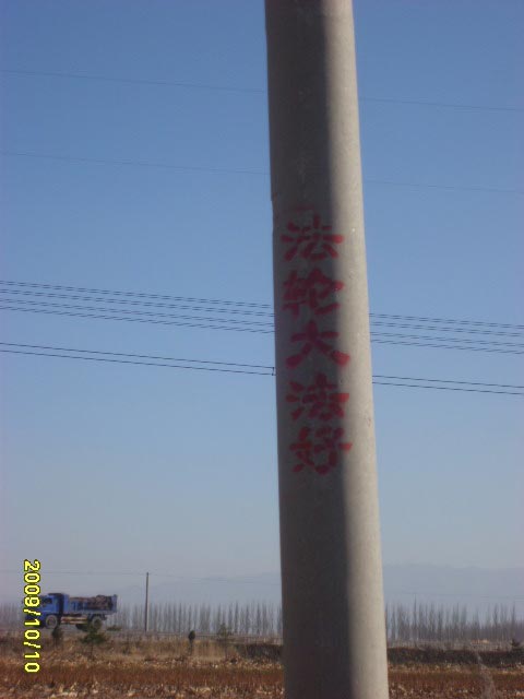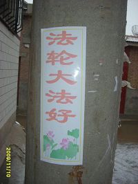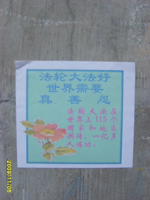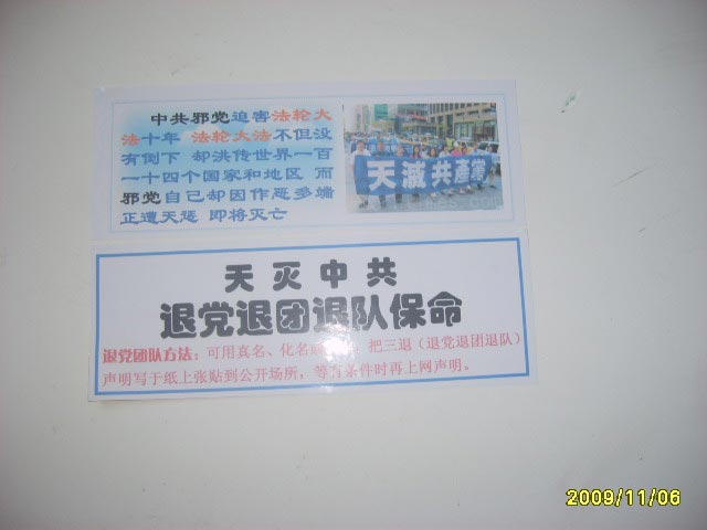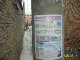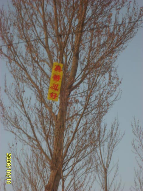 【明慧网二零零九年十二月六日】目前山西某市在住宅小区、乡镇要道吊挂、喷、贴大量的真相条幅和发放的真相资料有力的震慑着邪恶