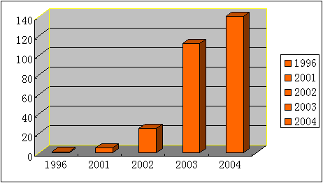 72 解放军第二医院(上海长征医院)网站上显示的该院“肝移植例数图”,原文被删,图片来源于国际互联网档案中心备份: https://web.archive.org/web/20050317130117/https://www.transorgan.com/about_g_intro.asp