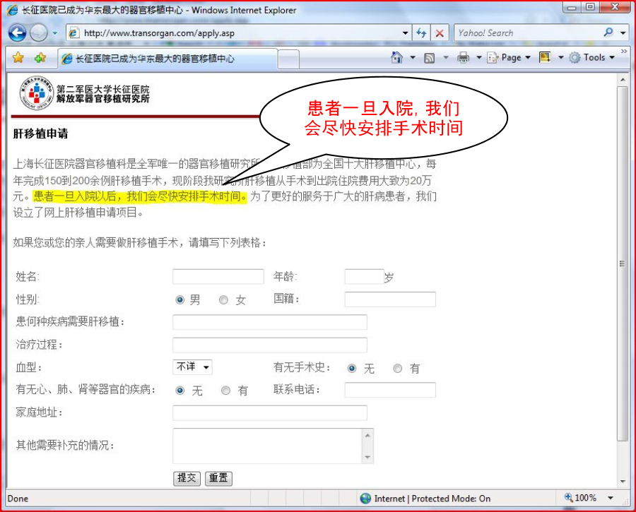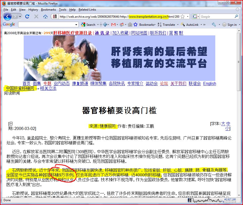 ![]() 天津东方器官移植中心在网站首页上显示的“肝移植成果”(2004肝移植例数世界第一)71 |