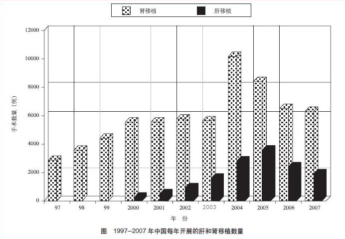 ![]() 中国卫生部副部长黄洁夫等曾在国际医学杂志《柳叶刀》(The Lancet)上发表文章“中国器官移植的政策”。79 其中有一副1997 年-2007年器官手术数量分布图。 |