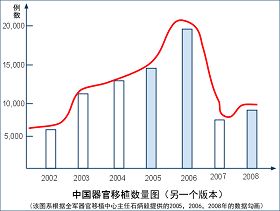 (此图是在原图的基础上,把黑条框所示的肝移植数量用白条框累加到肾移植数量上,并用红线勾画出增长趋势)