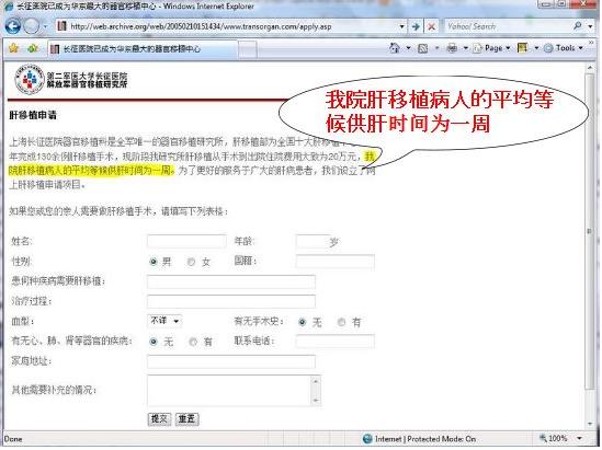 ![]() (原文被删,截图取自国际互联网档案中心的存储备份 https://web.archive.org/web/20060826070646/https: //www.transplantation.org.cn/html/2006-03/394.html) |