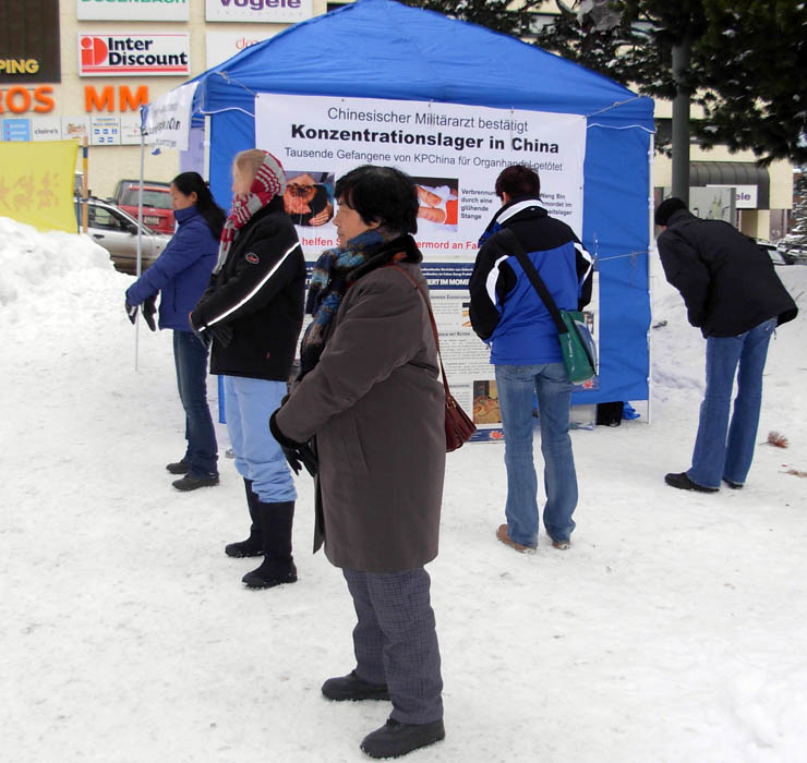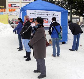 也有的人在和学员交谈中表示,瑞士太小了,我们的力量太小了,不能有什么效果。学员告诉他如果每个人都能站出来对中共说不,中共就会害怕了。如果每个人都认为自己的力量太微小没有作用,那中共就更可以为所欲为了。最后那人也签名要求停止迫害。