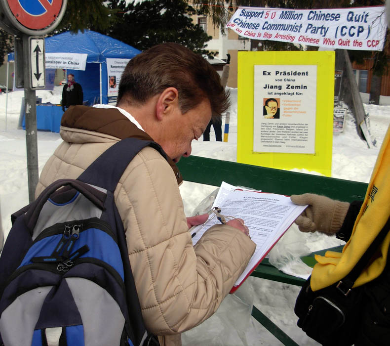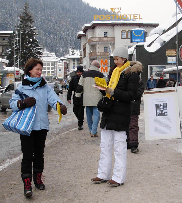 很多达沃斯的居民对法轮功的信息台非常熟悉,有的直接表示要签名制止这场迫害,有的仔细询问如何能提供更多的帮助。在过去的六年里,法轮功学员几乎每年都会在经济论坛期间来到达沃斯。