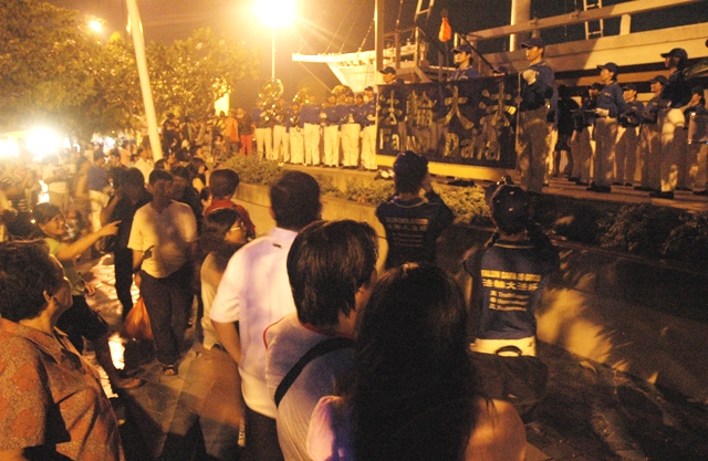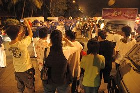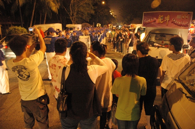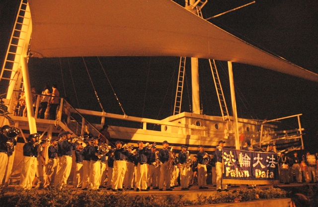晚间九时,天国乐团抵达现场,并在约一小时内为市民连续演奏了《法轮大法好》、《法鼓法号震十方》、《法正乾坤》、《送宝》、《欢乐颂》等乐曲,吸引了无数市民围观和拍照留念,同时向法轮功学员索取真相资料以更进一步了解法轮功。仙女队也于当晚派发精美的洪法莲花书签给市民,获得市民们欢迎。