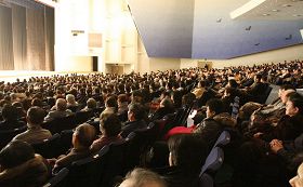 当天正值日本建国日假期,位于日本东京一流剧场,日本天皇家族观赏艺术公演必到的场所--昭和女子大学人见纪念讲堂(Hitomi Memorial auditorium of Tokyo Showa women’s University)人头涌涌,首场演出,两千座位几售一空。随着大幕的徐徐展开,天国世界的殊胜、庄严明亮映入观众眼帘,观众被神韵全善全美的演出所震撼。晚会结束后,含蓄不露,颇为内秀的日本观众难以抑制心中的激动,以经久不息的掌声向神韵艺术家们致谢。全体演员谢幕三次,观众才依依不舍的起坐离去。