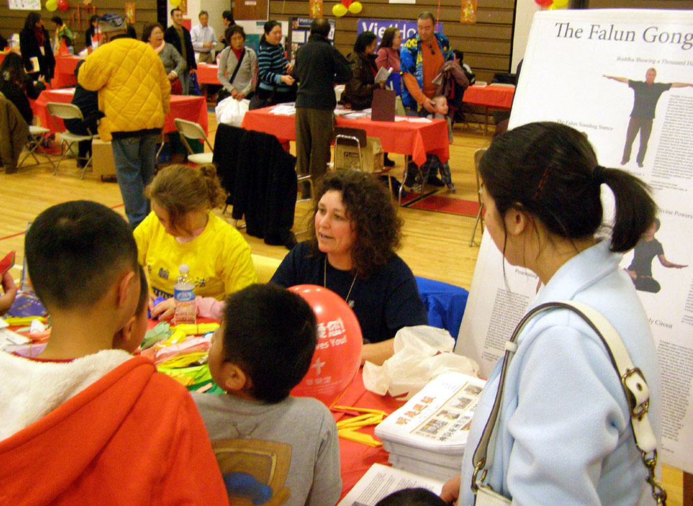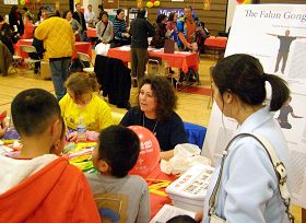 活动结束时,一位母亲带着四个女孩匆忙赶来,要求法轮功学员,“能不能做一朵莲花送我?”于是本来正在忙于收摊的法轮功学员停下来,耐心的教这位女士折叠纸莲花,并告知她们关于法轮功在大陆被迫害的真相。十五岁的大女儿当场表示要学功,还索取真相资料及光盘。最后母女五人学会了折叠纸莲花,也明白了法轮功的真相后,才高兴离开。