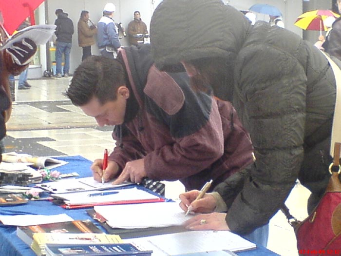 当法轮功学员感谢她在道义上的理解和支持时,她一边把信息资料捂在胸口,一边低头向学员鞠躬说到:“谢谢你!绝对是要谢谢你!”一位亚裔女士十年前就知道有法轮功,在雨中,她站在平和的炼功学员身边很近的地方,很长时间不舍得离开,最后,她到附近的售票点一次买下三张一等票。