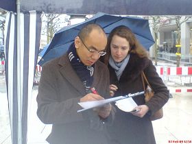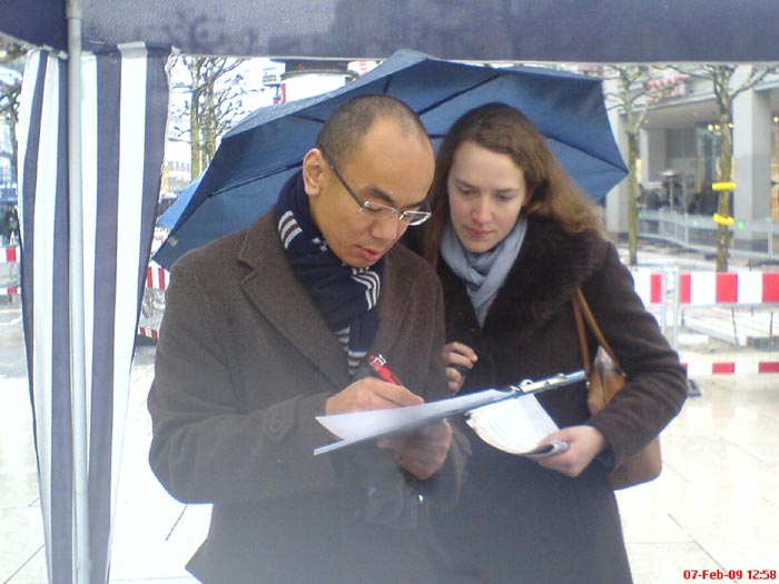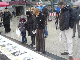 大量来自中国的游客看到了写着“中共必须停止干扰神韵”的中德文横幅,了解了中共真相的人们纷纷退!党!、退*团-、退*队-(即“三:退.”)。其中一位法轮功学员在三个多小时之内,就帮助八位大陆游客办理了“三:退.”手续。