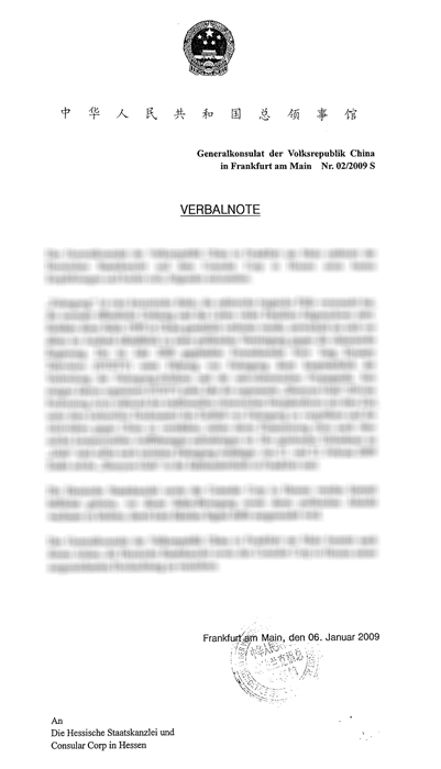 ![]() 中共驻法兰克福领事馆于1月6日致信黑森州州政府和当地外国领馆,以国家外交信函形式诋毁神韵艺术团。 |