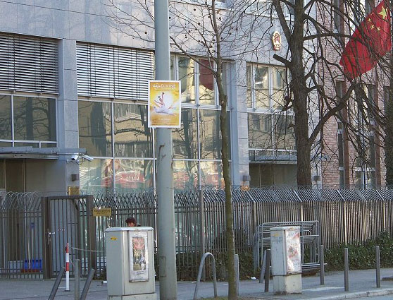 ![]() 在德国法兰克福中领馆门前的神韵海报 |
