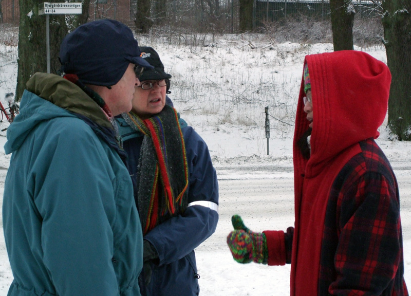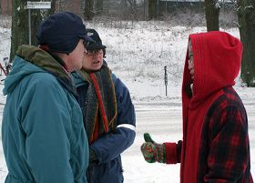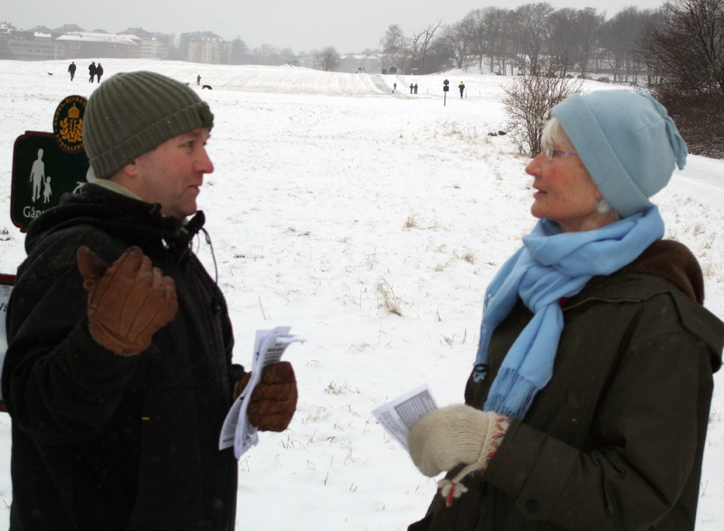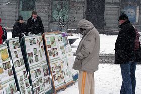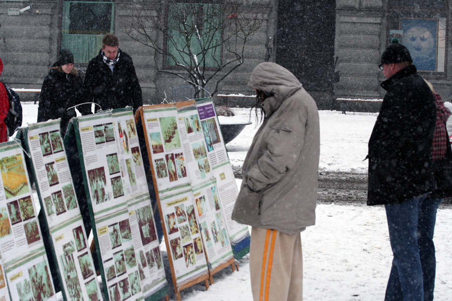 虽然天气不好,但仍然不影响人们来了解真相。很多人冒雪打着伞站在展板前了解真相。一位高个子、戴着眼镜的男士一接到真相传单就全明白了,他马上主动的和学员交谈起来。原来他是一个芬兰人。他说,他们家从他爷爷和他爸爸那辈就了解了共产党的邪恶,他本人也十分的讨厌共产党。他认为:共产党现在根本就不应该在这个世界上存在。他很感谢学员们所做的一切,不停的竖起大拇指,并表示愿意帮助学员,也要让更多的人了解中共本质。